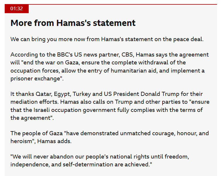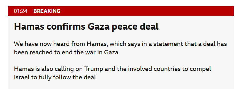Related: Editorials & Other Articles, Issue Forums, Alliance Forums, Region ForumsBreaking, per the BBC: Trump says Israel and Hamas 'both sign off' on first phase of Gaza peace plan (Hamas confirms)