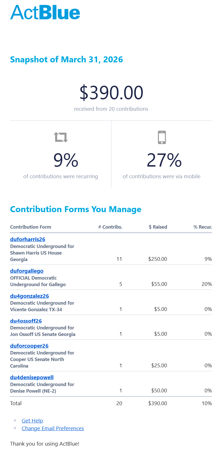 You raised $390.00 on March 31, 2026 @ ActBlue