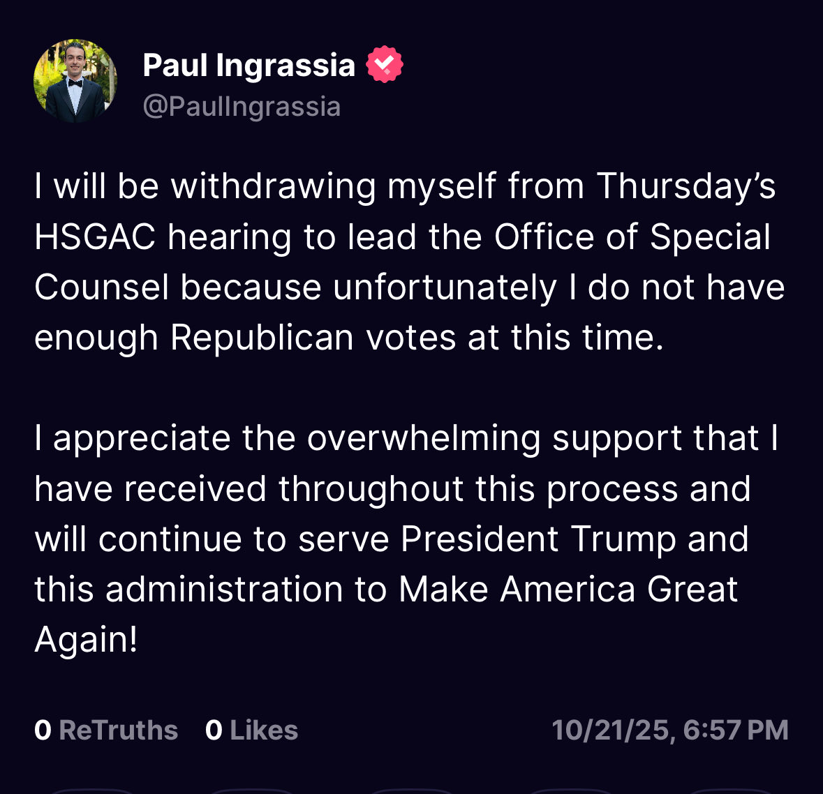 Senate Majority Leader John Thune just announced that Trump should withdraw his nominee, Paul Ingrassia, to head up the Office of Special Counsel. Senator Rick Scott has also announced that he won't support this Trump nominee.